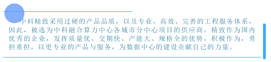 中科精致公司作為數(shù)據(jù)中心產(chǎn)品解決方案提供商,有著豐富的數(shù)據(jù)中心建設(shè)經(jīng)驗(yàn),并有強(qiáng)大的工程交付能力以及完善的服務(wù)體系,多年來以高標(biāo)準(zhǔn)完成眾多互聯(lián)網(wǎng)、企事業(yè)單位、醫(yī)療、金融、運(yùn)營商等各行業(yè)領(lǐng)域數(shù)據(jù)中心項(xiàng)目。